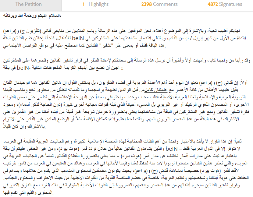 وراسل العديد من النشطاء على الإنترنت رئيس مجلس إدارة شبكة الجزيرة الإخبارية الشيخ حمد بن ثامر آل ثاني، وبعض مسؤولي الاعلام في قطر للتدخل من أجل ضمان عدم تشفير القناتين من قبل مجموعة ” bein “ وجعلهما متاحتين للجمهور، خصوصا وأن الكثير من الأسر تعتبرهما من أهم المصادر التربوية والتعليمية ذات المحتوى الهادف، اللتين تأتمن عليهما أطفالها.