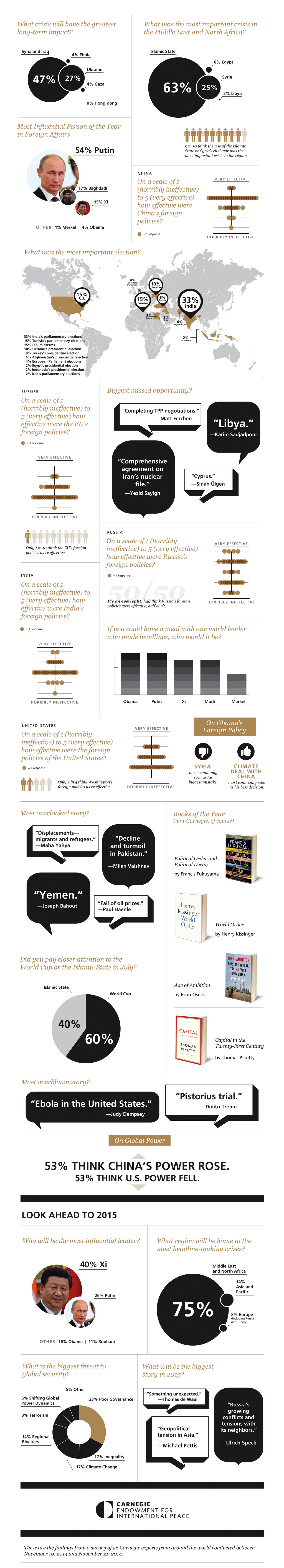وعن أكبر القصص فى 2015، يرى المشاركون أنها إما ستكون شيئا غير متوقعا أو روسيا تزيد الفجوة والصراعات بينها وبين جيرانها، أو توترات الجغرافيا السياسية في آسيا.