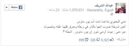 أما عبد الله الشريف مقدم البرامج الساخرة على يوتيوب فكتب على فيس بوك قائلًا: "منى البحيري بتاعت شت أب يور ماوس، أمين شرطة ضرب ابنها بالنار في رجله وحرق قلبها عليه وبتصوت، دير منى: بوت أرمي شوز إن يور ماوس .. اشطة؟"