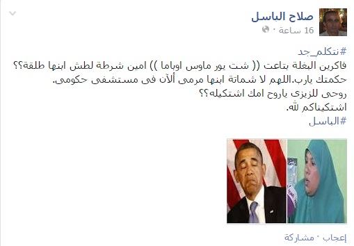 الناشط السياسي صلاح الباسل علق على "فيس بوك": "فاكرين البغلة بتاعت (( شت يور ماوس اوباما )) امين شرطة لطش ابنها طلقة؟؟،حكمتك يارب.اللهم لا شماتة ابنها مرمى ألآن في مستشفى حكومي.روحي للزيزي ياروح أمك اشتكيله؟؟اشتكيناكم لله."