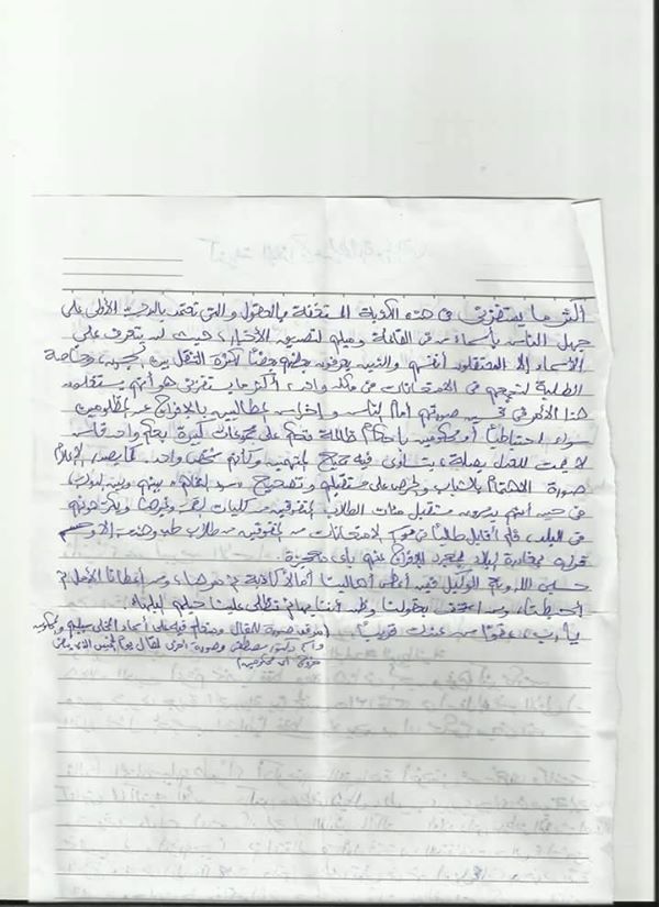 وأوضح الطالب المعتقل في رسالته المعنونة بـ"كذبة الإفراج عن الطلبة والمرضى"، أن نصف الأسماء الواردة في القرار هي لأشخاص أخلي سبيلم منذ شهور.