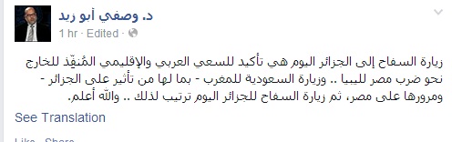 وتابع:" زيارة ملك السعودية للمغرب – بما لها من تأثير على الجزائر – ومرورها على مصر، ثم زيارة السفاح للجزائر اليوم ترتيب لذلك .. والله أعلم".