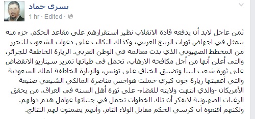 وتابع : الزيارة الخاطفة لملك السعودية والتي أعقبتها زيارة جون كيري حملت هواجس مناصرة المالكي الشيعي صنيعة الأمريكان -والذي انتهت ولايته للقضاء- على ثورة أهل السنة في العراق".