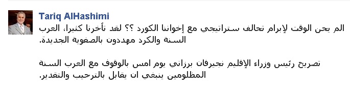 وتساءل الهاشمى:"الم يحن الوقت لإبرام تحالف إستراتيجي مع إخواننا الكورد ؟؟ لقد تأخرنا كثيرا، العرب السنة والكرد مهددون بالصفوية الجديدة".