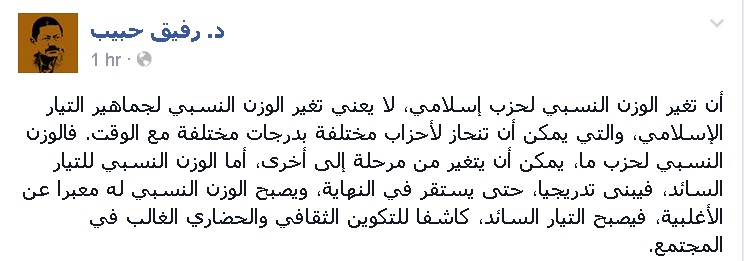 وأضاف حبيب فى تدوينة عبر صفحته على "فيس بوك": الوزن النسبي لحزب ما، يمكن أن يتغير من مرحلة إلى أخرى، أما الوزن النسبي للتيار السائد، فيبنى تدريجيا، حتى يستقر في النهاية، ويصبح الوزن النسبي له معبرا عن الأغلبية، فيصبح التيار السائد، كاشفا للتكوين الثقافي والحضاري الغالب في المجتمع".