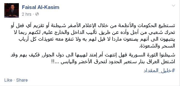 وأضاف القاسم فى تدوينة عبر صفحته على "فيس بوك": تستطيع الحكومات والأنظمة من خلال الإعلام الأصفر شيطنة أو تقزيم أي فعل أو تحرك شعبي من أجل وأده عن طريق تأليب الداخل والخارج عليه, لكنهم ربما لا ينتبهون إلى أنهم يصنعون ماردا لا قبل لهم به ولا تنفع معه تعويذات كل أرباب السحر والشعوذة.