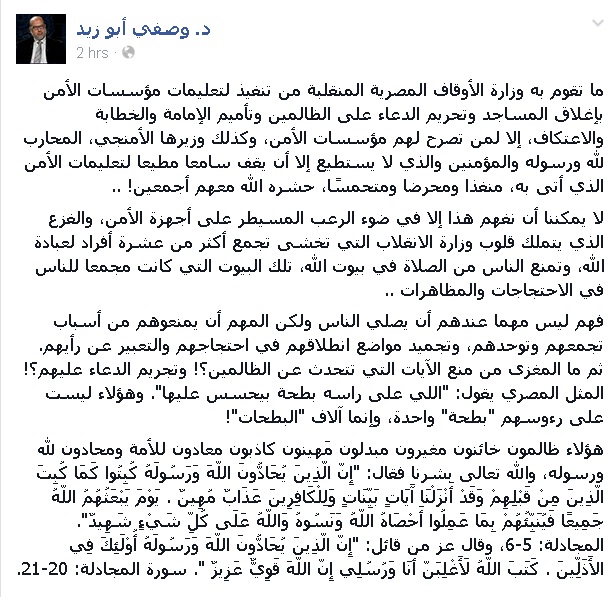 قال العضو التنفيذي لجبهة "علماء ضد الانقلاب" الدكتور وصفى أبو زيد، إن "ما تقوم به وزارة الأوقاف المصرية المنقلبة من تنفيذ لتعليمات مؤسسات الأمن بإغلاق المساجد وتحريم الدعاء على الظالمين وتأميم الإمامة والخطابة والاعتكاف، إلا لمن تصرح لهم مؤسسات الأمن، يكشف الرعب المسيطر على أجهزة الأمن، والفزع الذي يتملك قلوب وزارة الانقلاب التي تخشى تجمع أكثر من عشرة أفراد لعبادة الله، وتمنع الناس من الصلاة في بيوت الله، تلك البيوت التي كانت مجمعا للناس في الاحتجاجات والمظاهرات ".