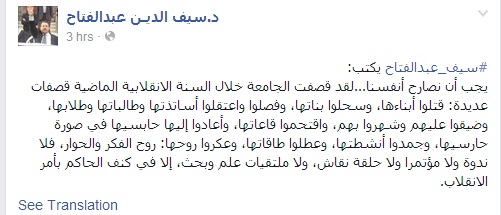 وأضاف عبد الفتاح فى تدوينة عبر صفحته على موقع التواصل الاجتماعي "فيس بوك": "يجب أن نصارح أنفسنا…لقد قصفت الجامعة خلال السنة الانقلابية الماضية قصفات عديدة: قتلوا أبناءها، وسحلوا بناتها، وفصلوا واعتقلوا أساتذتها وطالباتها وطلابها، وضيقوا عليهم وشهروا بهم، واقتحموا قاعاتها، وأعادوا إليها حابسيها في صورة حارسيها، وجمدوا أنشطتها، وعطلوا طاقاتها، وعكروا روحها: روح الفكر والحوار، فلا ندوة ولا مؤتمرا ولا حلقة نقاش، ولا ملتقيات علم وبحث، إلا في كنف الحاكم بأمر الانقلاب".