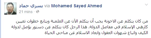 وقال في تدوينة عبر صفحته على "فيس بوك": من كان يتكلم عن الاخونة يجب أن يتكلم الآن عن العلمنة ويتابع خطوات تعيين كارهي الإسلام في مفاصل الدولة. هذا الرجل كان يتكلم عن دستور يؤصل لدولة الكيف وإتباع شهوات العقول وإبعاد الإسلام عن مناحي الحياة"