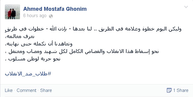 وقال غنيم فى تدوينة عبر صفحته الشخصية عبر فيس بوك:" ليكن اليوم خطوة وعلامة في الطريق .. لنا بعدها – بإذن الله – خطوات في طريقٍ نعرف معالمه، وتعاهدنا أن نكمله حتى نهايته، نحو إسقاط هذا الانقلاب والقصاص الكامل لكل شهيد ومصاب ومعتقل، نحو حرية لوطن مسلوب".