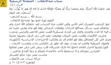 دعت حركة شباب ضد الانقلاب شباب مصر للثورة ضد الحكم العسكرى والظلم والقمع فى ذكرى مرور عام على الانقلاب الدموى قائلة: املئوا الميادين بثورتكم و لا تسمحوا لأحد بالاعتداء عليكم و ردوا الصاع صاعين .