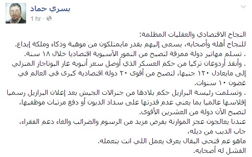 وقال حماد فى تدوينة عبر صفحته على موقع التواصل الاجتماعي" فيس بوك ": "للنجاح أهله وأصحابه، يسعى إليهم بقدر ما يمتلكون من موهبة وذكاء وملكة إبداع، تسلم مهاتير دولة ممزقة لتصبح من النمور الآسيوية اقتصاديا خلال ١٨ سنة،وأنقذ أردوغان تركيا من حكم العسكر الذي أوصل سعر أنبوبة غاز البوتاجاز المنزلي إلى ما يعادل ١٢٠ جنيها، لتصبح من أقوى ٢٠ دولة اقتصادية كبرى في العالم في غضون ١٠ سنوات."