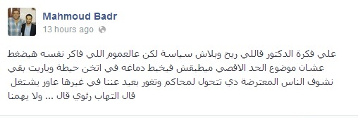 وقال في تدوينة له على حسابه على موقع التواصل الاجتماعي "فيس بوك": "اللي فاكر نفسه هيضغط عشان موضوع الحد الاقصي ميطبقش فيخبط دماغه في اتخن حيطة"، مضيفًا: "وياريت بقي نشوف الناس المعترضة دي تتحول لمحاكم وتغور بعيد عننا في غيرها عاوز يشتغل".