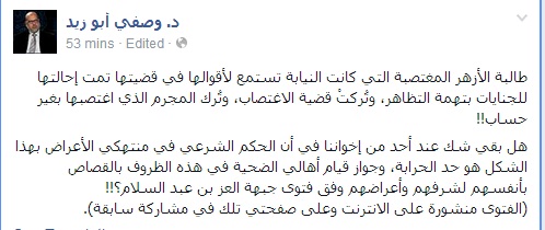 وأضاف أبو زيد فى تدوينة عبر صفحته على "فيس بوك": طالبة الأزهر المغتصبة التي كانت النيابة تستمع لأقوالها في قضيتها تمت إحالتها للجنايات بتهمة التظاهر، وتُركتْ قضية الاغتصاب، وتُرك المجرم الذي اغتصبها بغير حساب!!.