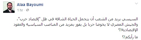 وقال البيومى فى تدوينة عبر موقع التواصل الاجتماعي"فيس بوك":"السيسي يريد من الشعب أن يتحمل الحياة الشاقة في ظل "اقتصاد حرب"، والجيش المصري لا يخوضا حربًا بل يفوز بمزيد من المناصب السياسية والعقود الاقتصادية!؟".