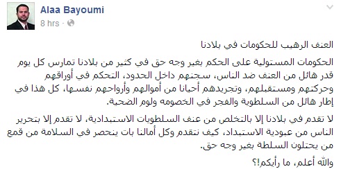 وأضاف البيومي في تدوينة عبر صفحته على موقع التواصل الاجتماعي "فيس بوك": "لا تقدم في بلادنا إلا بالتخلص من عنف السلطويات الاستبدادية، لا تقدم إلا بتحرير الناس من عبودية الاستبداد، كيف نتقدم وكل أمالنا بات ينحصر في السلامة من قمع من يحتلون السلطة بغير وجه حق."