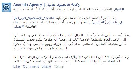 أعلنت الحكومة العراقية، في رسالةٍ إلى الأمين العام للأمم المتحدة "بان كي مون"، أن تنظيم "الدولة الاسلامية داعش"، استولى على مستودع للأسلحة الكيماوية في "العراق"، يعود لعهد الرئيس "صدام حسين" وكانت قوة عراقية بالتعاون مع الامم المتحدة تسيطر عليه.