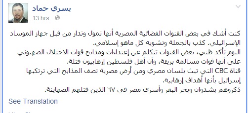 وأضاف حماد عبرا صفحته على مواقع التواصل الاجتماعي "فيس بوك":"كنت أشك في بعض القنوات الفضائية المصرية أنها تمول وتدار من قبل جهاز الموساد الإسرائيلي. كذب بالجملة وتشويه كل ماهو إسلامي، اليوم تأكد ظني، بعض القنوات تتكلم عن اعتداءات ومذابح قوات الاحتلال الصهيوني على أنها قوات مسالمة بريئة، وأن أهل فلسطين إرهابيون قتلة".