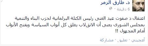 وقال الزمر فى تغريدة عبر صفحته على "تويتر":اعتقال د صفوت عبد الغنى رئيس الكتلة البرلمانية لحزب البناء والتنمية بمجلس الشورى يعنى أن اﻻنقﻻب يغلق كل أبواب السياسة ويفتح اﻷبواب أمام المجهول !!
