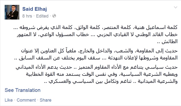وقال اللحاج في تدوينة عبر صفحته على موقع التواصل الاجتماعي "فيس بوك": "كلمة إسماعيل هنية، كلمة المنتصر، كلمة الواثق، كلمة الذي يفرض شروطه …خطاب القائد الوطني لا القيادي الحزبي … خطاب المسئول الواعي، لا المتهور الطائش".