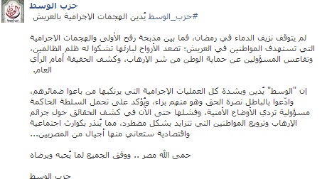 وقال الحزب فى بيان له عبر صفحته الرسمية على "فيس بوك":" إن الوسط يُدين وبشدة كل العمليات الإجرامية التي يرتكبها من باعوا ضمائرهم، وادّعوا بالباطل نصرة الحق وهو منهم براء، ويُؤكد على تحمل السلطة الحاكمة مسؤولية تردي الأوضاع الأمنية، وفشلها حتى الآن في كشف الحقائق حول جرائم الإرهاب وترويع المواطنين التي تتزايد بشكل مضطرد، مما يُنذر بكوارث اجتماعية واقتصادية ستعاني منها أجيال من المصريين".