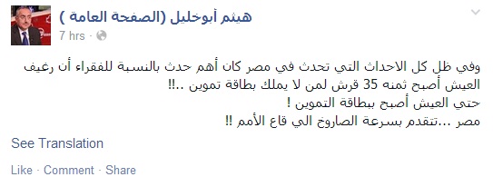 وقال أبو خليل في تدوينة عبر صفحته على موقع التواصل الاجتماعي "فيس بوك": "وفي ظل كل الأحداث التي تحدث في مصر؛ كان أهم حدث بالنسبة للفقراء أن رغيف العيش أصبح ثمنه 35 قرشا، لمن لا يملك بطاقة تموين."