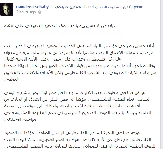ودعا صباحي النظام المصري لموقف أكثر قوة وصلابة وانحيازا للشعب الفلسطيني لا يساوى بين العدو وفلسطين، مؤكدا أن قيمة ووزن مصر ودورها وقدرها تستحق بذل المزيد من الجهود السياسية والدبلوماسية؛ لوقف العدوان الصهيوني والانتصار لقيمة وحق المقاومة. ومؤكدا على أنه لا أحد يستطيع الانتقاص من وزن مصر وقيمتها. داعيا مختلف الأطراف الإقليمية والدولية للابتعاد عن مثل هذه الأدوار الصغيرة فى ظل ما تواجهه فلسطين وشعبها، وأن الأولوية الآن لحقن دماء الشعب الفلسطيني دونما إهدار لحقوقه.