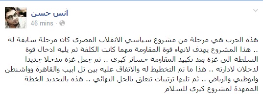 قال الباحث السياسى، أنس حسن إن الحرب الصهيونية على غزة هى مرحلة من مشروع سياسي الانقلاب المصري كان مرحلة سابقة له.