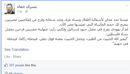 استنكر يسرى حماد، نائب رئيس حزب الوطن شماتة بعض الإعلاميين المصريين فى شهداء القصف الصهيونى على قطاع غزة من النساء والأطفال قائلا: "لم أر يهودي يفرح في مقتل جنود إسرائيل ولكني رأيت صهاينة مصريين فرحين بمقتل نساء فلسطين".