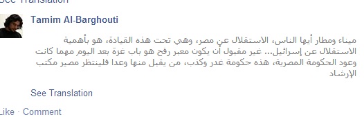 وأضاف البرغوثى فى تدوينة عبر صفحته على موقع التواصل الاجتماعي "فيس بوك":"غير مقبول أن يكون معبر رفح هو باب غزة بعد اليوم مهما كانت وعود الحكومة المصرية، هذه حكومة غدر وكذب، من يقبل منها وعدا فلينتظر مصير مكتب الإرشاد".
