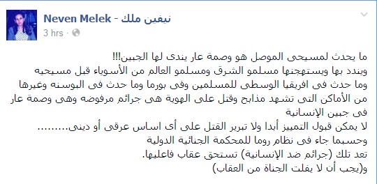 وأضافت ملك فى تدوينة عبر صفحتها على "فيس بوك": أن ما حدث فى أفريقيا الوسطى للمسلمين وفى بورما وما حدث فى البوسنة وغيرها من الأماكن التى تشهد مذابح وقتل على الهوية هى جرائم مرفوضة وهى وصمة عار فى جبين الإنسانية".