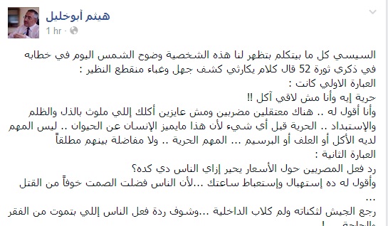 وأضاف فى تدوينة عبر صفحته على موقع التواصل الاجتماعي"فيس بوك": السيسي كل ما بيتكلم بتظهر لنا هذه الشخصية وضوح الشمس اليوم في خطابه في ذكري ثورة 52 قال كلام كارثي كشف جهل وغباء منقطع النظير".