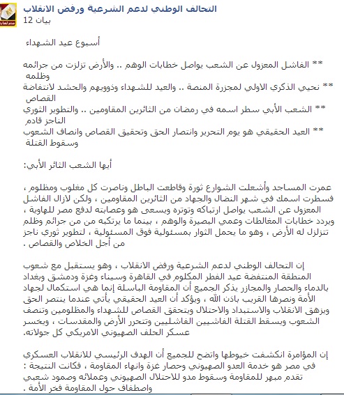 وأضاف البيان : إن التحالف الوطني لدعم الشرعية ورفض الانقلاب ، وهو يستقبل مع شعوب المنطقة المنتفضة عيد الفطر المكلوم في القاهرة وسيناء وغزة ودمشق وبغداد بالدماء والحصار والمجازر يذكر الجميع أن المقاومة الباسلة إنما هي استكمال لجهاد الأمة ونصرها القريب باذن الله ، ويؤكد أن العيد الحقيقي يأتي عندما ينتصر الحق ويزهق الانقلاب والاستبداد والاحتلال ويتحقق القصاص للشهداء والمظلومين وتنصف الشعوب ويسقط القتلة الفاشيين الفاشلين وتتحرر الأرض والمقدسات ، ويخسر عسكر الحلف الصهيوني الامريكي كل جولاته.