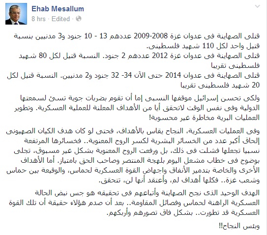 وأضاف مسلم، فى تدوينة عبر صفحته على "فيس بوك":"قتلى الصهاينة في عدوان غزة 2008-2009 عددهم 13 – 10 جنود و3 مدنيين بنسبة قتيل واحد لكل 110 شهيد فلسطيني، وقتلى الصهاينة في عدوان غزة 2012 عددهم 2 جنود. النسبة قتيل لكل 80 شهيد فلسطيني تقريبا، أما قتلى الصهاينة فى عدوان 2014 حتى الآن 34- 32 جنود و2 مدنيين. النسبة قتيل لكل 20 شهيد فلسطيني تقريبا".