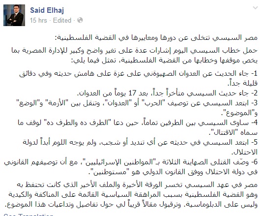 قال سعيد الحاج، الباحث السياسى إن خطاب المشير عبد الفتاح السيسي، قائد الانقلاب العسكري، حمل إشارات عدة على تغير واضح وكبير للإدارة المصرية بما يخص موقفها وخطابها من القضية الفلسطينية.