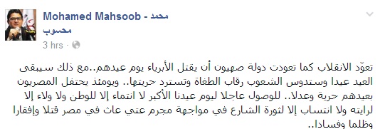 وأضاف محسوب فى تدوينة، اليوم الاثنين، عبر صفحته على "فيس بوك":كما تعوّد الانقلاب كما تعودت دولة صهيون أن يقتل الأبرياء يوم عيدهم..مع ذلك سيبقى العيد عيدا وستدوس الشعوب رقاب الطغاة وتسترد حريتها.. ويومئذ يحتفل المصريون بعيدهم حرية وعدلا.