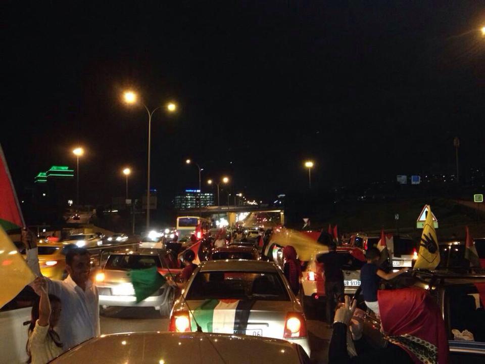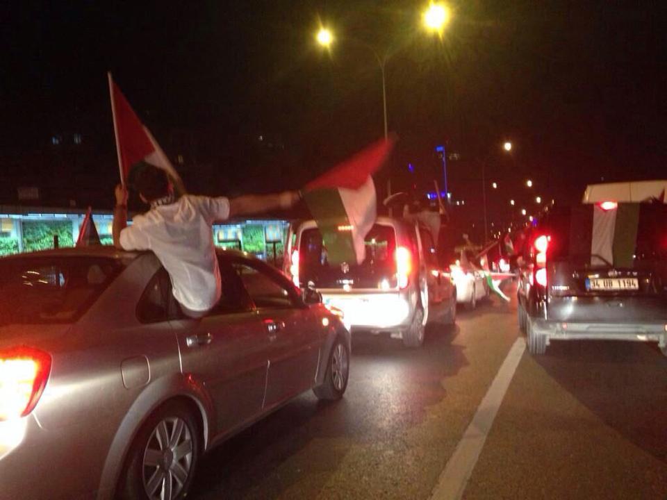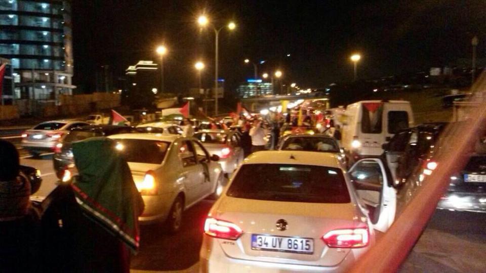 خرجت مسيرات ليلية بالسيارات في شوارع "إسطنبول" بـ "تركيا"، حيث رفع المشاركون أعلام "فلسطين" على السيارات، فيما شدد المشاركون على تضامنهم مع الشعب الفلسطيني.