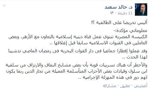 أكد الدكتور خالد سعيد المتحدث باسم الجبهة السلفية والقيادى بتحالف دعم الشرعية، أنه يمتلك معلومات مؤكدة تفيد بأن الكنيسة المصرية تنتوى إطلاق قناة دينية إسلامية وذلك بالتعاون مع مشيخة الأزهر وبعض العاملين فى القنوات الإسلامية سابقًا قبل إغلاقها.