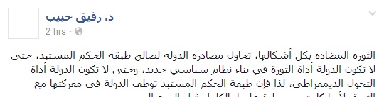 وأضاف حبيب في تدوينة عبر صفحته على موقع التواصل الاجتماعي "فيس بوك": "أن طبقة الحكم المستبد توظف الدولة في معركتها مع الثورة، لأنها كانت مسيطرة عليها بالكامل قبل الربيع العربي".
