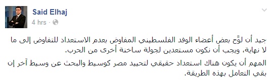 وقال الحاج فى تدوينة عبر صفحته على "فيس بوك": "جيد أن لوَّح بعض أعضاء الوفد الفلسطيني المفاوض بعدم الاستعداد للتفاوض إلى ما لا نهاية، ويجب أن نكون مستعدين لجولة ساخنة أخرى من الحرب".