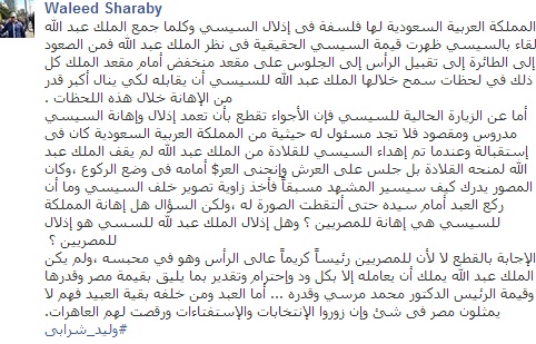 وأضاف أن " أجواء الزيارة الحالية للسيسي تقطع بأن تعمد إذلال وإهانة السيسي مدروس ومقصود فلا تجد مسئول له حيثية من المملكة العربية السعودية كان فى إستقبالة وعندما تم إهداء السيسي للقلادة من الملك عبد الله لم يقف الملك عبد الله لمنحه القلادة بل جلس على العرش وإنحنى العر$ أمامه فى وضع الركوع ،وكان المصور يدرك كيف سيسير المشهد مسبقاً فأخذ زاوية تصوير خلف السيسي وما أن ركع العبد أمام سيده حتى التقطت الصورة له ،ولكن السؤال هل إهانة المملكة للسيسي هي إهانة للمصريين ؟ وهل إذلال الملك عبد لله للسسي هو إذلال للمصريين ؟."