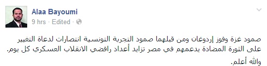 وأضاف بيومي في تدوينة عبر صفحته على موقع التواصل الاجتماعي "فيس بوك": "صمود غزة وفوز أردوغان، ومن قبلهما صمود التجربة التونسية؛ انتصارات لدعاة التغيير على الثورة المضادة، يدعمهم في مصر تزايد أعداد رافضي الانقلاب العسكري كل يوم".