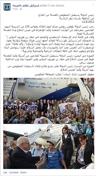 وقالت الصفحة الرسمية لدولة اسرائيل الناطقة بالعربية:"وقال رئيس الدولة رؤوفين ريفلين في كلمته لدى الإستقبال الشخصي والحميم في مطار بن غوريون الدولي :" إن قدومكم الى إسرائيل هو رسالة للعالم أجمع. ليس هناك منظمة إرهابية تحول دون عودة الشعب اليهودي لبناء وطنه. أنتم جميعا أولادنا وأبناؤنا".