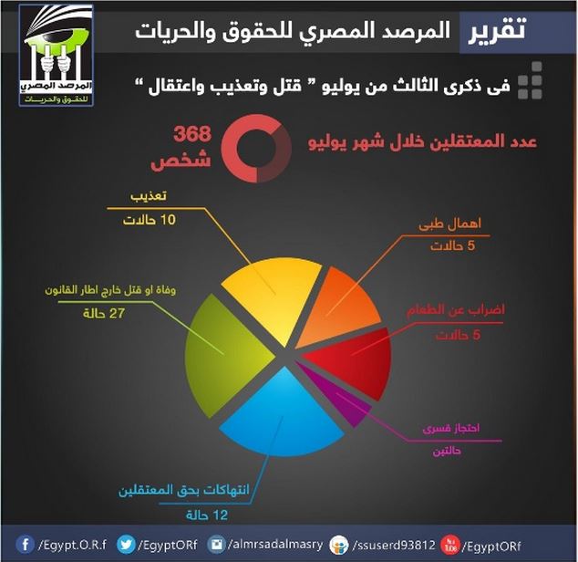 صار الشعب المصري على موعد مع القتل والاعتقال والتعذيب على يد قوات الشرطة المصرية، التي تصر على امتهان كرامة المواطن المصري، وسلبه أبسط حقوقه المشروعة في التظاهر والتتعبير عن الرأي، مستخدمةً فى ذلك القوة المفرطة، دون أي مراعاة للحقوق والحريات التى تكفلها الأعراف والمواثيق الدولية، المعنية بحقوق الإنسان، وعلى رأسها الإعلان العالمي لحقوق الإنسان، والعهد الدولي الخاص بالحقوق المدنية والسياسية، وكذلك القانون والدستور المصري، الذي يكفل حق الشعب في التظاهر و التعبيرعن الرأي، إذ قام رجال الشرطة، وبالمخالفة لكل ما سبق، باعتقال أكثر من 368 مصري خلال شهر يوليو الماضي، لرفضهم ما يمارس ضدهم، وكذلك قتل 27 حالة خارج إطار القانون، وتعذيب 10 حالات داخل أقسام الشرطة، وفي أماكن الاحتجاز المختلفة، وتعريض حياة العشرات للخطر الشديد بسبب الإهمال الطبي تارة، ورفض نقلهم للمستشفيات لتلقي العلاج تارةً اخرى، وذلك كعقاب من رجال الشرطة للرافضين لما حدث في مصر والمطالبين بالحرية.