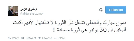 وشدد الزمر في تغريدة له على "تويتر": "دموع مبارك والعادلى تشعل نار الثورة وﻻ تطفئها.. ﻷنها أكدت للباقين أن 30 يونيو هي ثورة مضادة".