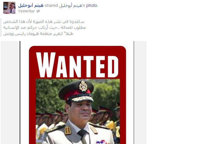 وكان الناشط الحقوقي هيثم خليل نشر عبر صفحته الشخصية عبر موقع التواصل ااجتماعي الفيسبوك  تعليقا علي صورة لقائد الانقلاب المشير السيسي قائلا"ساعدونا في نشر هذه الصورة لأن هذا الشخص،مطلوب للعدالة ..حيث أرتكب جرائم ضد الإنسانية،طبقا" لتقرير منظمة هيومان رايتس ووتش.