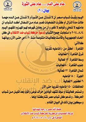 أصدرت حركة "شباب ضد الانقلاب"، بياناً  بالفعاليات التي قام بها شباب الحركة في "القاهرة"، اليوم الخميس، في بيان رقم 1 بعنوان " عام علي الدم .. عام علي الثورة" .