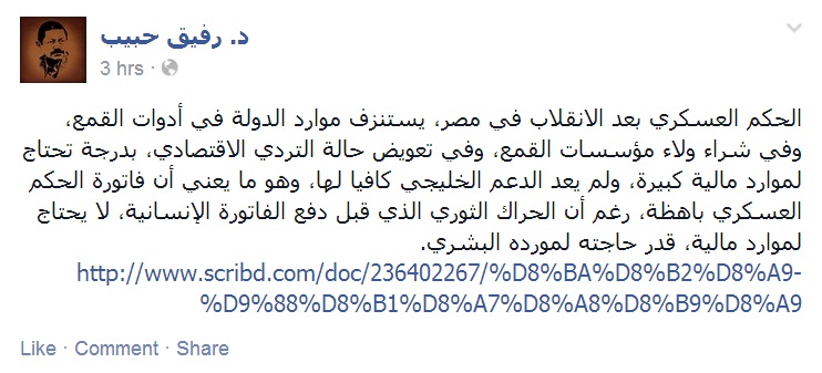 قال الدكتور رفيق حبيب المفكر القبطي، إن الحكم العسكري بعد الانقلاب في مصر، يستنزف موارد الدولة في أدوات القمع، وفي شراء ولاء مؤسسات القمع، وفي تعويض حالة التردي الاقتصادي، بدرجة تحتاج لموارد مالية كبيرة.