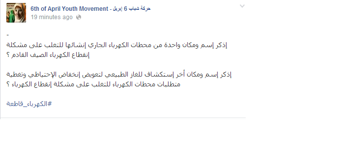 سخرت حركة شباب 6 إبريل من عجز حكومة الانقلاب عن حل أزمة انقطاع التيار الكهربائي يوميا لساعات طويلة متسائلة :"اذكر إسم ومكان واحدة من محطات الكهرباء الجاري إنشائها؛ للتغلب على مشكلة إنقطاع الكهرباء الصيف القادم ؟.