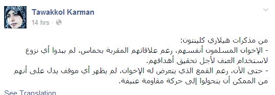 واستشهدت كرمان عبر صفحتها فى "فيس بوك" بشهادة هيلارى كلينتون وزيرة الخارجية السابقة بحق الإخوان ونفيها لجوء الجماعة للعنف على مدى تاريخها: "من مذكرات هيلاري كلينتون: – ﺍﻹﺧﻮﺍﻥ ﺍﻟﻤﺴﻠﻤون ﺃﻧﻔﺴﻬﻢ، ﺭﻏﻢ ﻋﻼﻗﺎﺗﻬﻢ ﺍﻟﻤﻘﺮﺑﺔ ﺑﺤﻤﺎﺱ، ﻟﻢ يبدوا أي نزوع لاستخدام العنف لأجل تحقيق أهدافهم، حتى الآن، رغم القمع الذي يتعرض له الإخوان، لم يظهر أي موقف يدل على أنهم من الممكن أن يتحولوا إلى حركة مقاومة عنيفة".